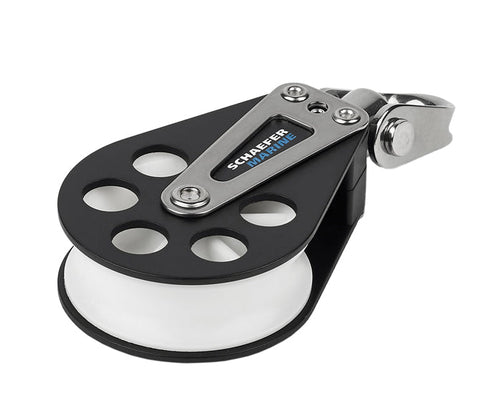 Single block with aluminum cheeks. Delrin(tm) sheave ensures smooth operation and a high safe working load. Swivel head may be locked in place to eliminate twisting. Sheave Dia. 2 3/8" (60mm), Thickness 1 3/32" (28mm), Width 2 1/2" (64mm), Length 5 1/32" (128mm), SWL 2250 lbs. (1020kg), Weight 7.4oz (210g), Max Line size 1/2" (13mm)