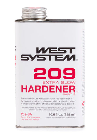 209 Extra Slow Hardener is formulated for use with West System Brand 105 Resin for general coating and bonding applications in extremely warm and/or humid conditions or when extended working time is desired at room temperature. Provides approximately twice the working time of 206 Slow Hardener. Forms a clear, amber-colored solid with good physical properties and moisture resistance for bonding and coating applications. Not intended for clear coating.