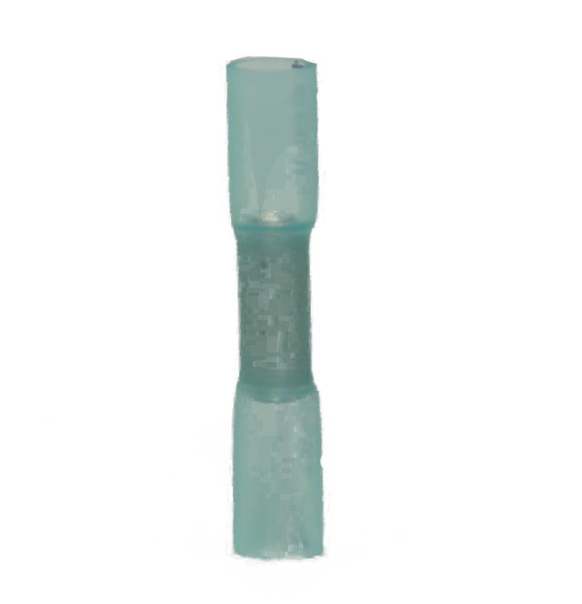Butt Splice Connector, Wire Size: 16 - 14 AWG, 1.5 Inch Overall Length, Seamless Barrel, Barrel Diameter: 0.196 Inch ID, Heat Shrink Polyolefin Insulation, Material: Copper, Blue