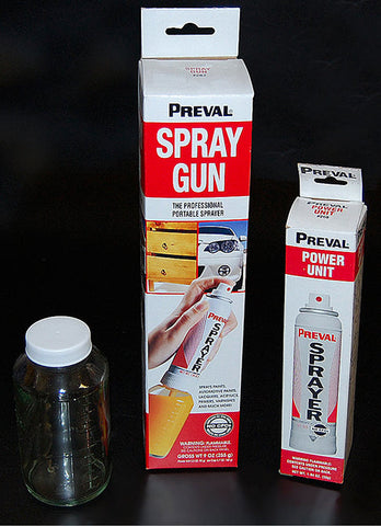 The Preval Sprayer is an aerosol-based spray system that allows the user to mix up any paint, chemical or solution and turn it in to sprayable material through Preval’s patented Venturri Vacuum Process. This process draws the medium from the attached reservoir and delivers a professional-grade finish on virtually any surface without mixing the propellant and medium together. This results in an unadulterated finish with no color change.