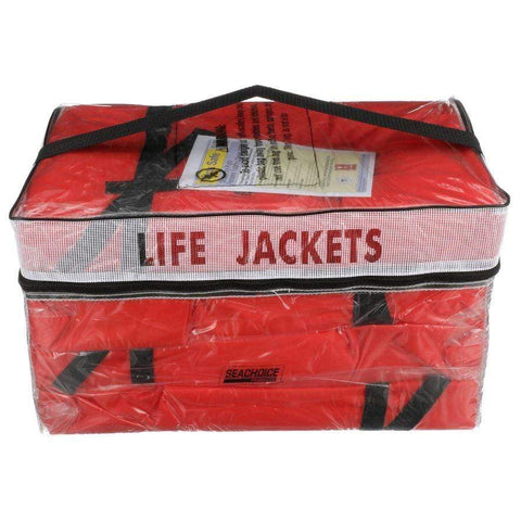 UV resistant marine grade vinyl carry bag. Contains (4) adult-sized Universal Life Vests (Type II PFD).