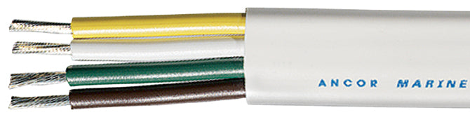 Ancor flat trailer cable features white, green yellow and black Marine Grade primary conductors (correctly color-coded to ABYC standards) in a white common jacket that is made for easy removal while providing the best abrasion resistance available. These cables exceed UL 1426 standards and are made from the highest quality ultra flexible (Type 3/Class K) tinned copper stranding that provides maximum protection against corrosion and electrolysis while resisting fatigue due to vibration and flexing. The premium vinyl insulation is rated at 600 volts, 105 deg C dry and 75 deg C wet, stays flexible even in extreme cold (-40 deg F/C) and resists salt water, battery acid, oil, gasoline, heat, abrasion and ultra-violet radiation