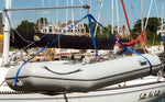 Three attachment straps (2” nylon webbing) and stainless hoisting ring make dinghy-lifting easy using only a halyard.