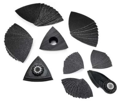 63-piece accessory set for sanding in corners and on edges. Suitable for all FEIN MultiTools and all other commercially available multi-tools with the Starlock mount. As a set, attractive savings compared to individual purchase. Contents: 2 sanding pads, unperforated (3-1/8 [80] in[mm]), 1 sanding finger, 10 sanding sheets each (grits 60, 80, 120) for sanding pad and sanding finger.