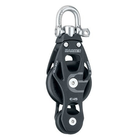 Harken's 45 mm Aluminum Element Fiddle Block - Swivel introduces sideplates that combine forged aluminum and compound curves for strength. It's contemporary and very robust design pairs the minimum amount of metal required to protect the sheave with a proven journal bearing.