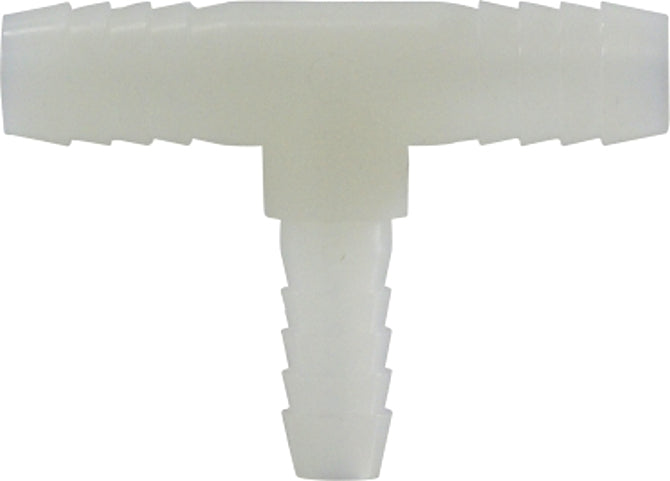 Nylon Reducing Tee is barbed on all sides. 3/4 x 3/4 x 1/2.