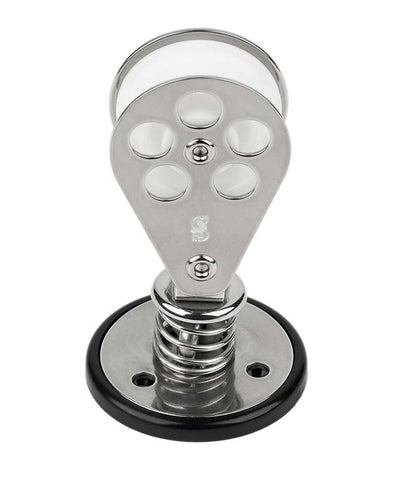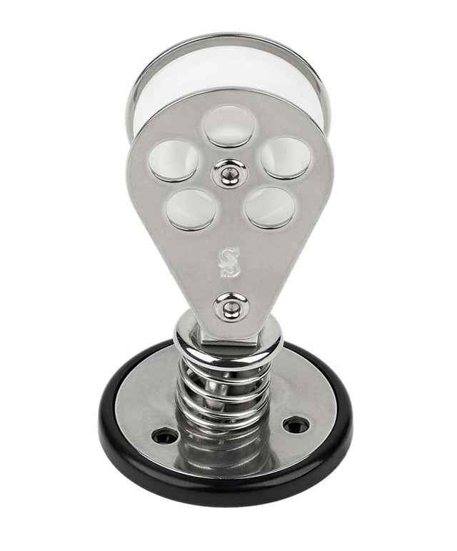 Stand up spring block with Stainless Steel cheeks. Delrin(tm) sheave ensures smooth operation and high safe working load. Separate backing plate #97-60.