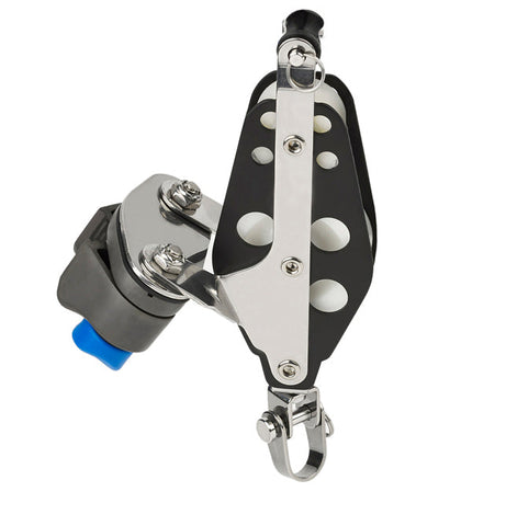 Fiddle block with swivel shackle, cam cleat and becket. Works with 303-45 for a 4:1 purchase. Delrin sheaves ensure smooth operation and high safe working load. Fast entry cam cleat allows for easy line engagement.