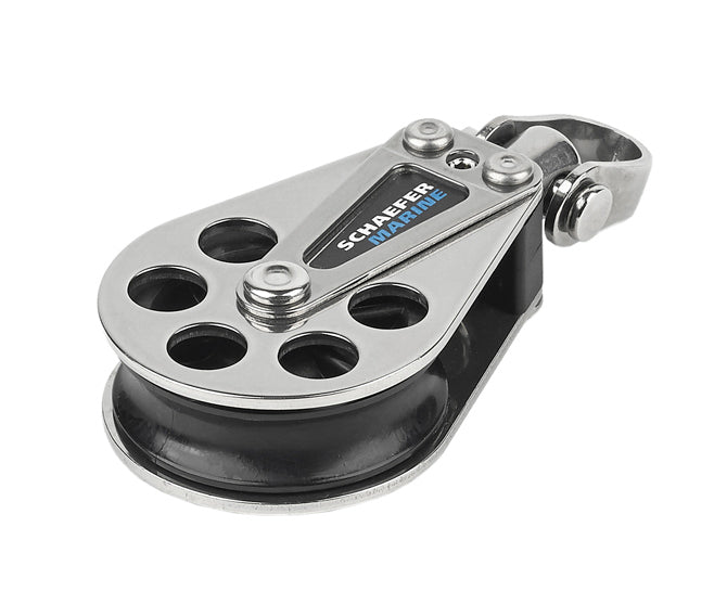 Single block with stainless steel cheeks. Delrin(tm) sheave ensures smooth operation and high safe working load. Sheave Dia. 2" (51mm), Thickness 15/16" (24mm), Width 2 1/8" (54mm), Length 4 13/32" (112mm), SWL 1750 lbs. (795kg), Weight 7.1oz (201g), Max Line 7/16" (11mm)