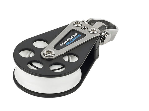 Single block with aluminum cheeks and ball bearing sheave. Delrin(tm) ball bearing sheave ensures low-friction operation. Swivel head may be locked in place to avoid twist. Sheave Dia. 2" (51mm), Thickness 15/16" (24mm), Width 2 1/8" (54mm), Length 4 13/32" (112mm), SWL 1500 lbs. (680kg), Weight 5oz. (142g), Max Line 7/16" (11mm)