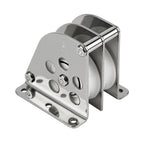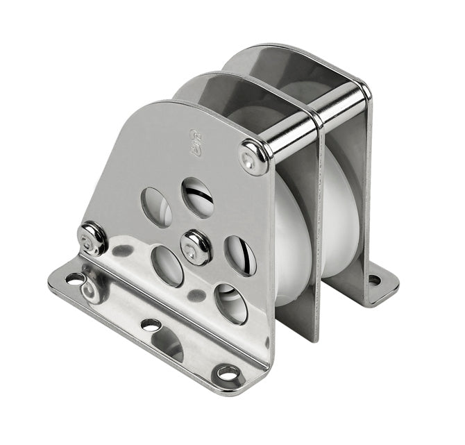 5 Series Double Over the Top Block. Stainless Steel cage and base provide a solid platform for clean leads. Delrin(tm) ball bearing sheaves ensure low-friction and high safe working loads.Sheave Dia. 2" (51 mm), Max line 7/16" (11 mm), L 2-7/8" (73 mm), W 2-3/4" (76 mm), H 2-15/16" (74 mm), Bearing Height 2" (51 mm), Fastners (6), #10 RH (5 mm), C/C 2-5/16" (59 mm), SWL 1000 lbs. (450 kg), Weight 12.6 oz. (357 g)