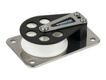 7 Series Cheek Block with anodized Aluminum cheek. Delrin(tm) sheave ensures smooth operation and high safe working load. Stainless steel base distributes loads to a large surface area. Sheave Dia. 2-3/8" (60 mm), Max Line 1/2" (13 mm), L 4-3/8" (111 mm), W 2-3/4" (70 mm), H 1" (25 mm), Fasteners (4) 1/4" RH (6 mm), C/C 3-5/8" (92 mm), SWL 2250 lbs. (1020 kg), Weight Aluminum 9.6 oz. (272 g)
