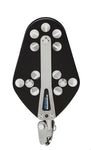 Fiddle block with anodized aluminum cheeks. Works with 704-75 for a 4:1 purchase. Delrin(tm) sheaves feature a single top sheave and two in-line sheaves to spread the load reducing friction and chafe. Swivel head design may be locked in place to avoid twist. Upper Sheave Dia. 2 3/8" (60mm), Lower sheaves diameter 1-13/16" (46mm) Thickness 1 3/32" (28mm), Width 3 31/32" (101mm), Length 7 15/32" (190mm), SWL 2250 lbs. (1020kg), Weight 14.3oz(405g), Max Line 1/2" (13mm)