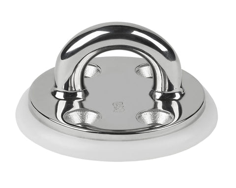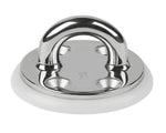 Round base Stainless Steel investment cast padeye. 316 Stainless Steel includes delrin(tm) base. Order Backing Plate 97-53 separately. Eye Width 1" (25 mm), Eye Height 13/16" (21 mm), Eye Stock 3/8" (10 mm), Length 2-1/2" (64 mm), Width 2-1/2" (64 mm), Fasteners (4), 1/4" FH (6 mm), C/C A 1" (25 mm), C/C B 1-1/2" (38 mm), SWL 4000 lbs. (1800 kg)