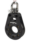 Single Block. Computer machined block finished in hardcoat anodized black for durability. Torlon(tm) rollers and Delrin(tm) ball bearings ensure a low-friction aluminum sheave that will handle high loads. Machined center of the block may be used as a " becket" eliminating the need for other blocks. Forged 17-4 high strength D Shackle on a swivel head may be locked in place to eliminate line twist. Flushing holes in each cheek allow easy flushing. Safe Working Load 5000lb(2270kg), Weight 12.0oz (340gm), Max Line 5/8"(16mm), Sheave Diameter 3.2" (82mm), Shackle 5/16" (8mm) 17-4ph, Length 6.3" (160mm), Width 3.2" (82mm)