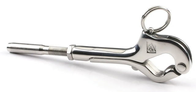This is our latest and best design yet.  Features the "over center" design with no load on the swinging hook when closed.  This feature allows easy opening yet stays secure with a heavy split ring on the plunger latching device.  Investment Cast T-316 Stainless.