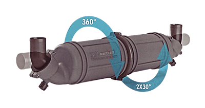 The construction of this new VETUS waterlock/muffler consists of two rotatable components. The hose connections are also fully rotatable, ensuring simple and time-saving installation in a wide range of applications.