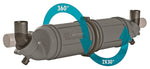 Horizontal two chamber waterlock/muffler with rotatable components and hose connections. Simple and time-saving installation. Capacity 3 liters.