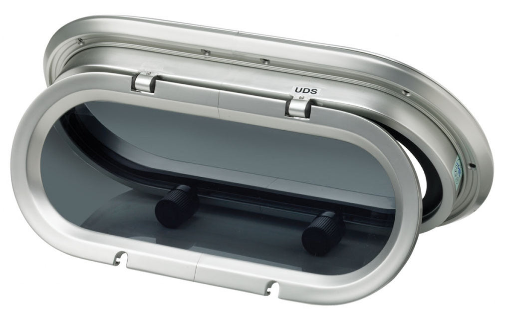 Fitted with friction hinges, permitting them to stay open in any position. Two large diameter knobs ensure that the Portholes can be closed completely watertight.