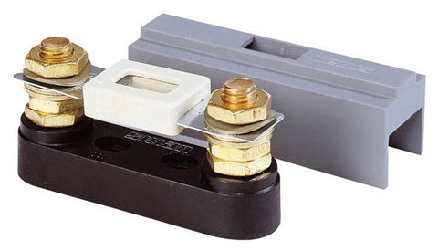 Fuse holder with protective cover for slow blow fuses 40 - 500 Amp. The holder is also suitable for the storage of spare fuses.